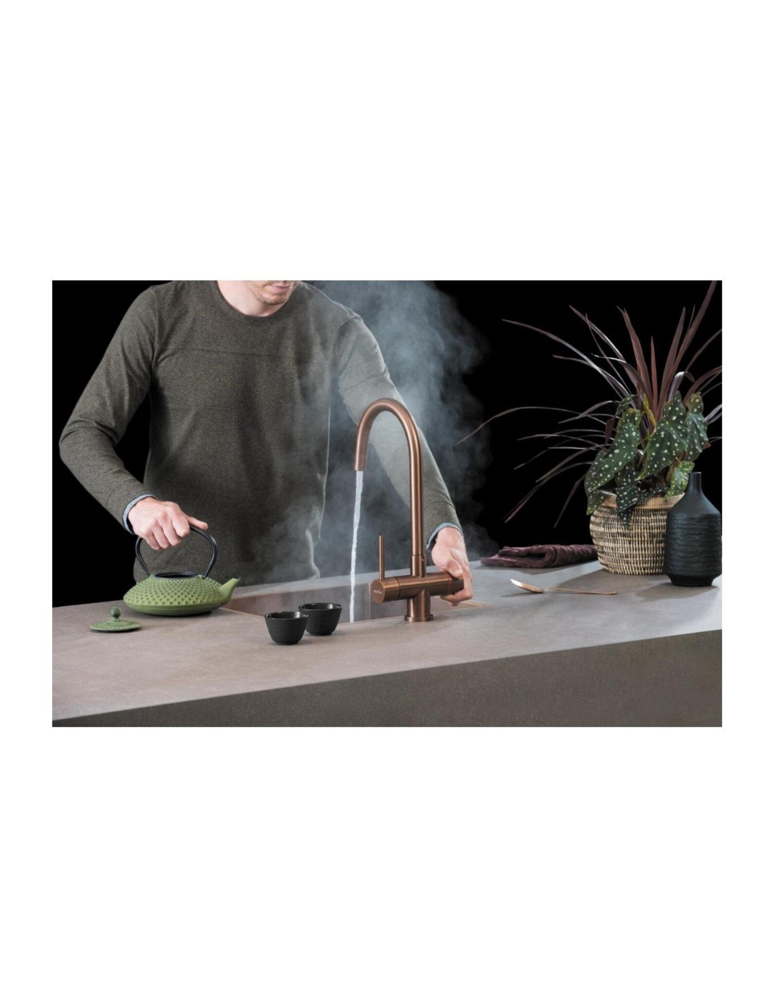 Met de Selsiuz Push & Turn 3-in-1 Rond Copper Koper kokend waterkraan heb je maar één kraan op het aanrecht voor koud, warm en kokend water.