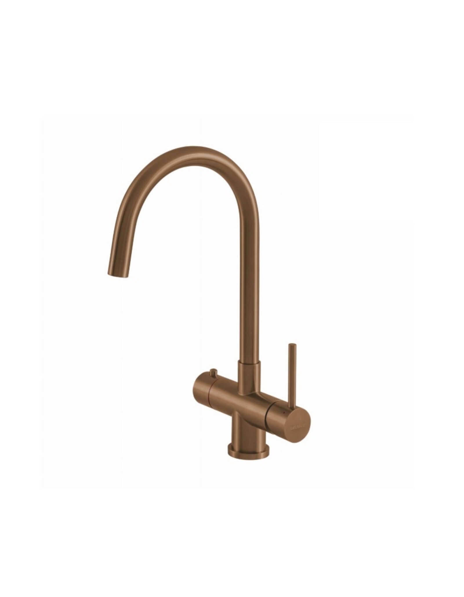 De Selsiuz 351210 Push & Turn 3-in-1 Rond Copper Koper met Combi (Extra) Boiler heeft een veilige druk-draai bediening voor kokend water. Door de knop eerst in te drukken en vervolgens te draaien, stroomt het kokend water uit de kraan. De rechter hendel bedient het koude en warme water. Dankzij deze gescheiden bediening is de kraan veilig en praktisch in dagelijks gebruik.