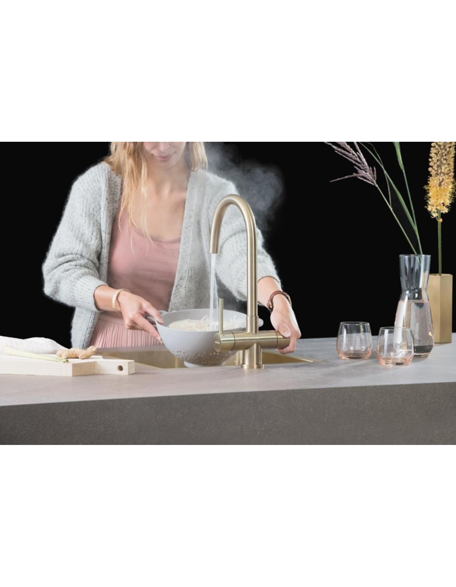 De Selsiuz 351211 Push & Turn 3-in-1 Rond Gold Goud met Combi (Extra) Boiler heeft een veilige druk-draai bediening voor kokend water. Door de knop eerst in te drukken en vervolgens te draaien, stroomt het kokend water uit de kraan. De rechter hendel bedient het koude en warme water. Dankzij deze gescheiden bediening is de kraan veilig en praktisch in dagelijks gebruik.