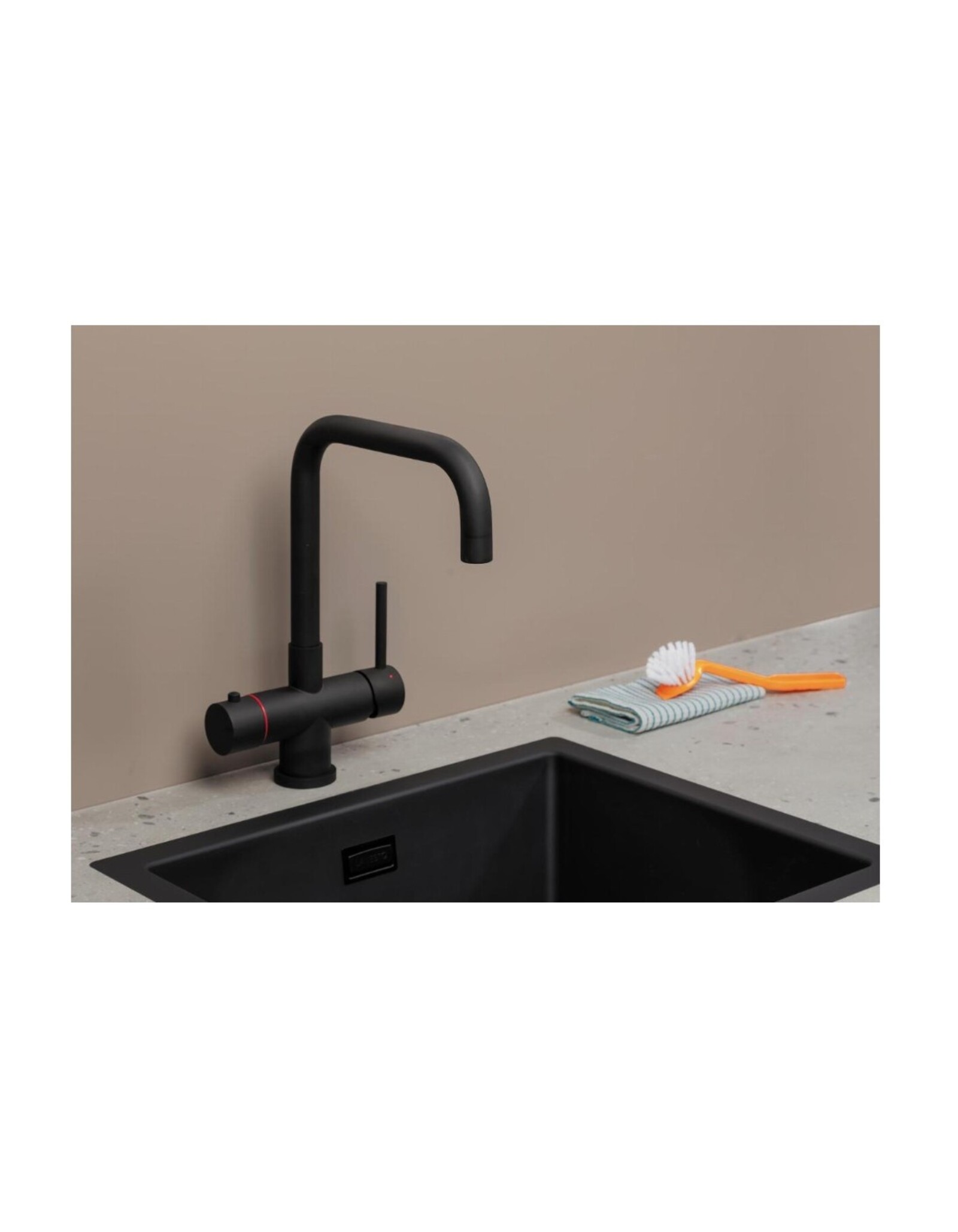 De Push & Turn 3-in-1 kokendwaterkraan Haaks Sturdy Black Zwart heeft een veilige druk-draai bediening voor kokend water. Door de knop eerst in te drukken en vervolgens te draaien, stroomt het kokend water uit de kraan. De rechter hendel bedient het koude en warme water. Dankzij deze gescheiden bediening is de kraan veilig en praktisch in dagelijks gebruik.