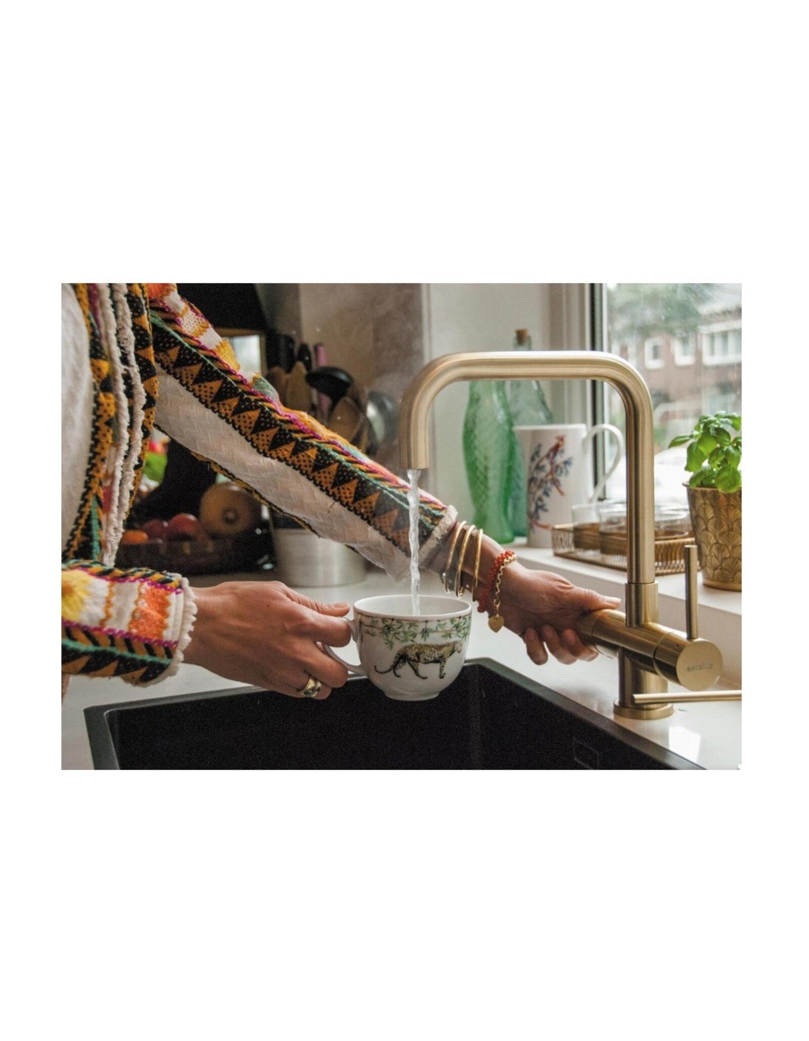De Selsiuz Push & Turn 3-in-1 Haaks Gold kokend water kraan heeft een veilige druk-draai bediening voor kokend water. Door de knop eerst in te drukken en vervolgens te draaien, stroomt het kokend water uit de kraan. De rechter hendel bedient het koude en warme water. Dankzij deze gescheiden bediening is de kraan veilig en praktisch in dagelijks gebruik.
