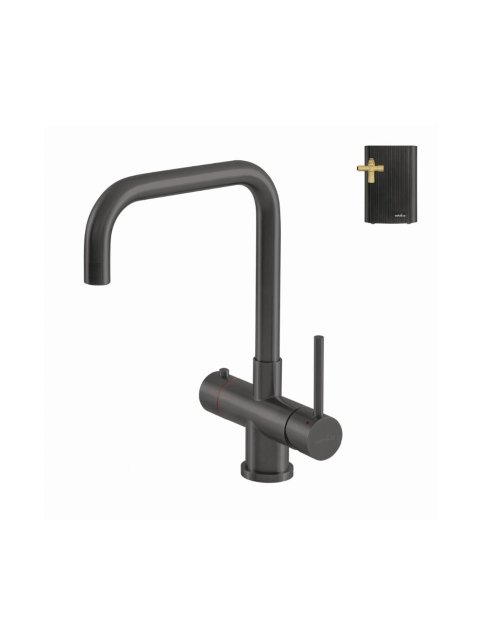 De kraan is uitgerust met een druk-draai-bedienings-knop voor volmaakte veiligheid. Hij wisselt direct van koud naar kokend water en andersom zonder dat de uitloop van de kraan warm wordt. De Selsiuz Push & Turn 3-in-1 Haaks Gun Metal kraan is gemaakt van echt RVS (Inox).