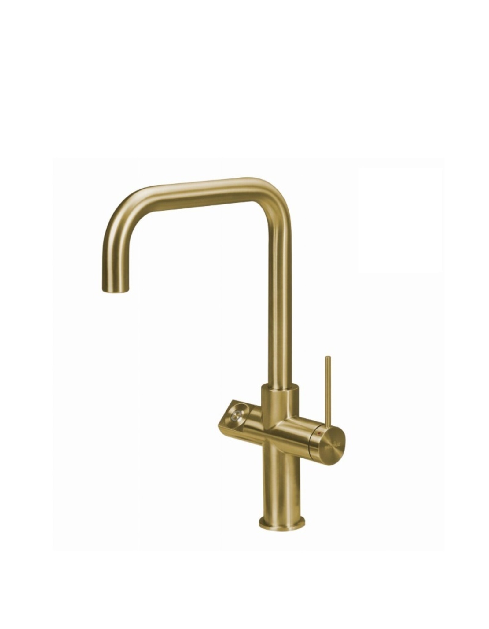 De Selsiuz Click 3-in-1 Haaks Gold kokend water kraan is voorzien van een stijlvolle en functionele drukknop aan de linkerzijde voor kokend water. De rechter hendel bedient het koude en warme water. Dankzij deze gescheiden bediening is de kraan veilig en praktisch in dagelijks gebruik.